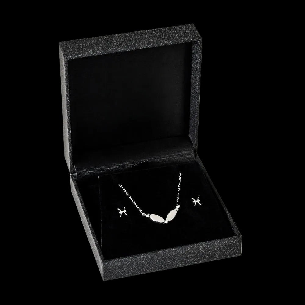 The Pisces Gift Box Set contains a Pisces Zodiac Necklace and a matching pair of Pisces Drop Earrings — both sterling silver 925 with Swarovski crystals, presented together in a signature LYC black luxury gift box. Ready to give immediately.